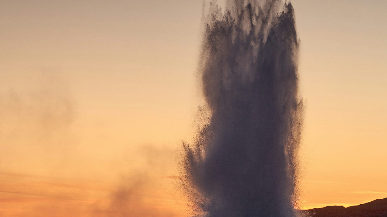 Wallpaper Silhouette of People Beside Geyser at Sunset