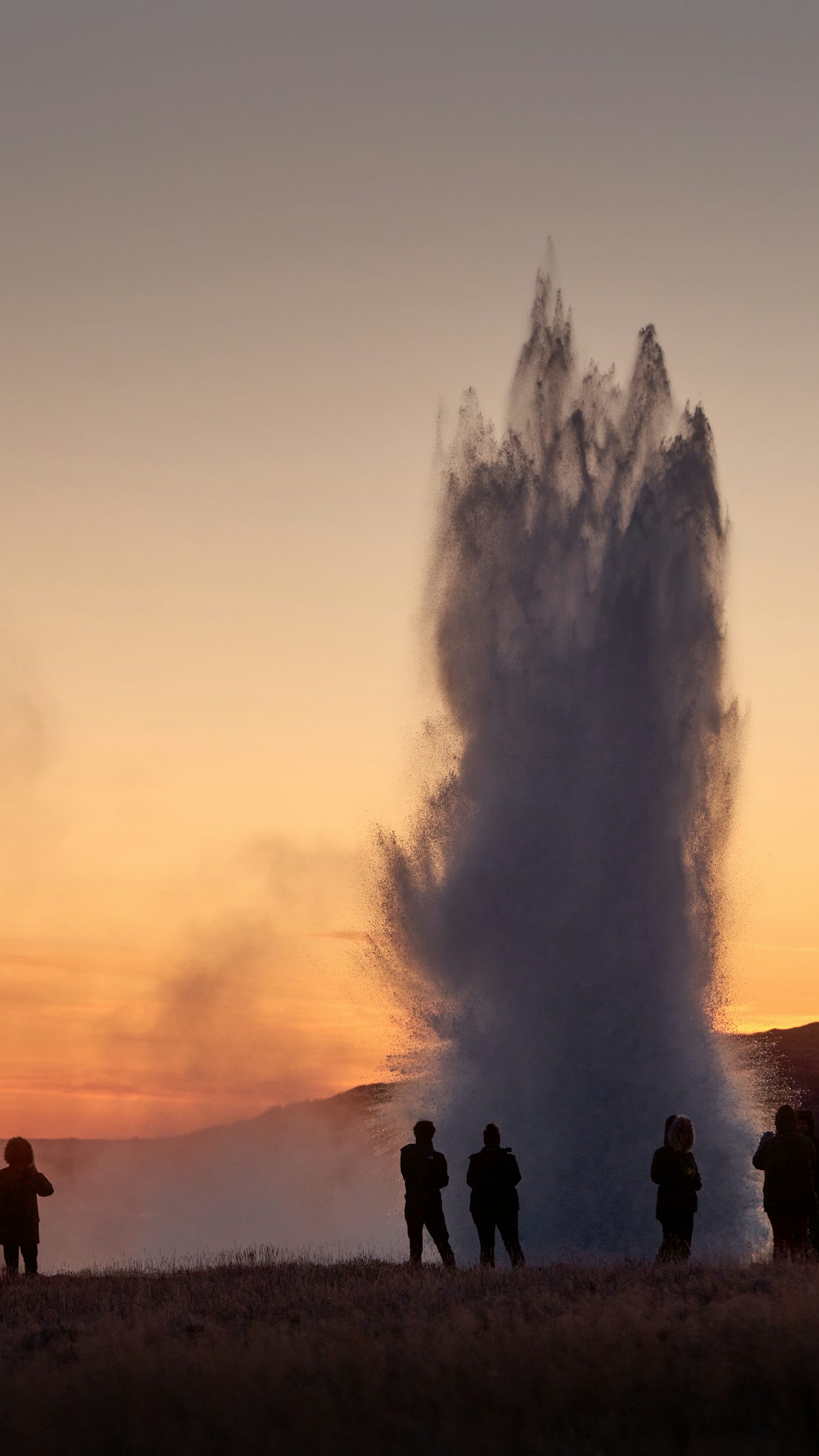 Keywords: silhouette, people, geyser, sunset, landscape, nature, geothermal, hot spring, eruption, steam, dusk, twilight, shadow, figures, scenery, outdoor