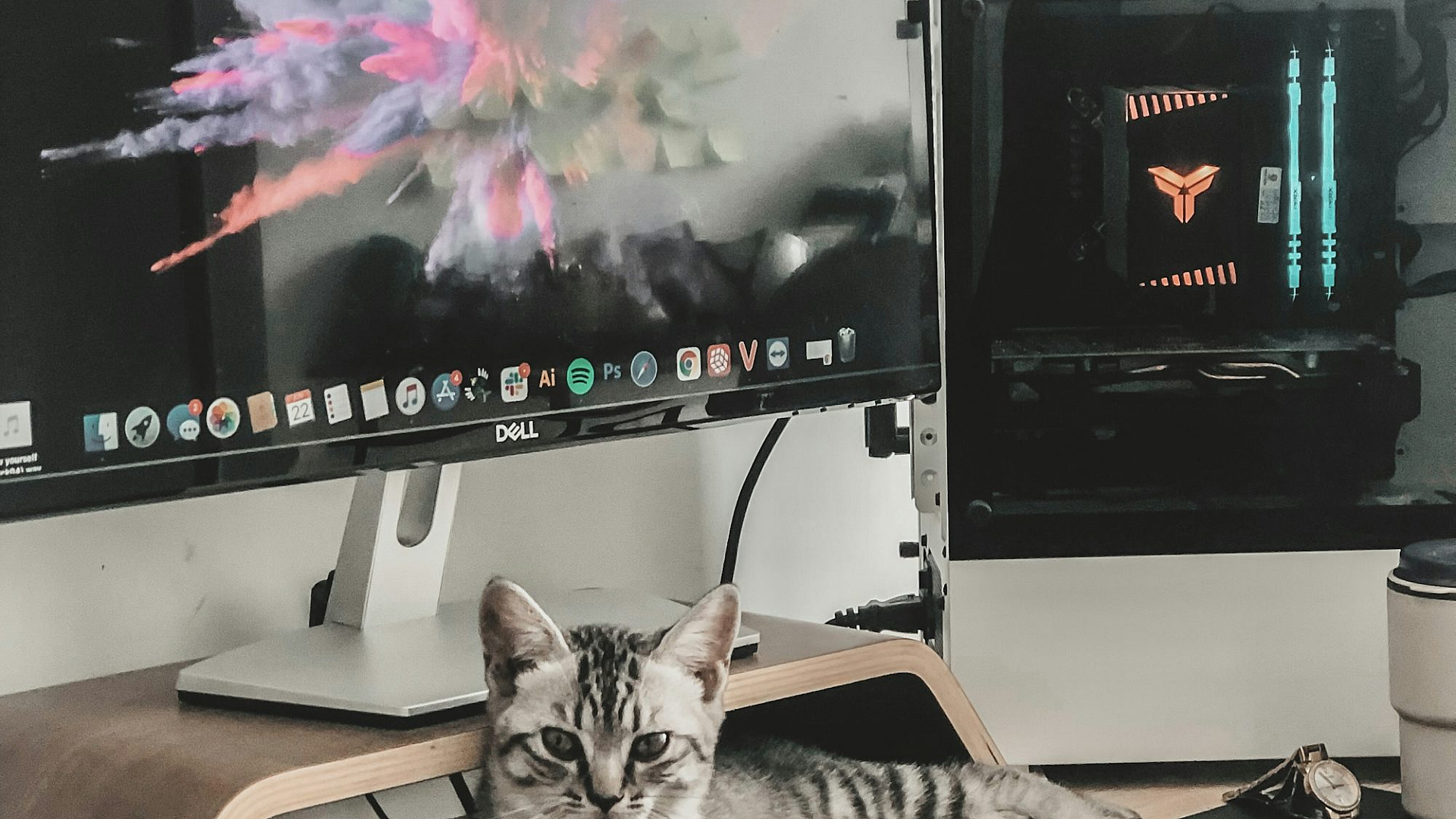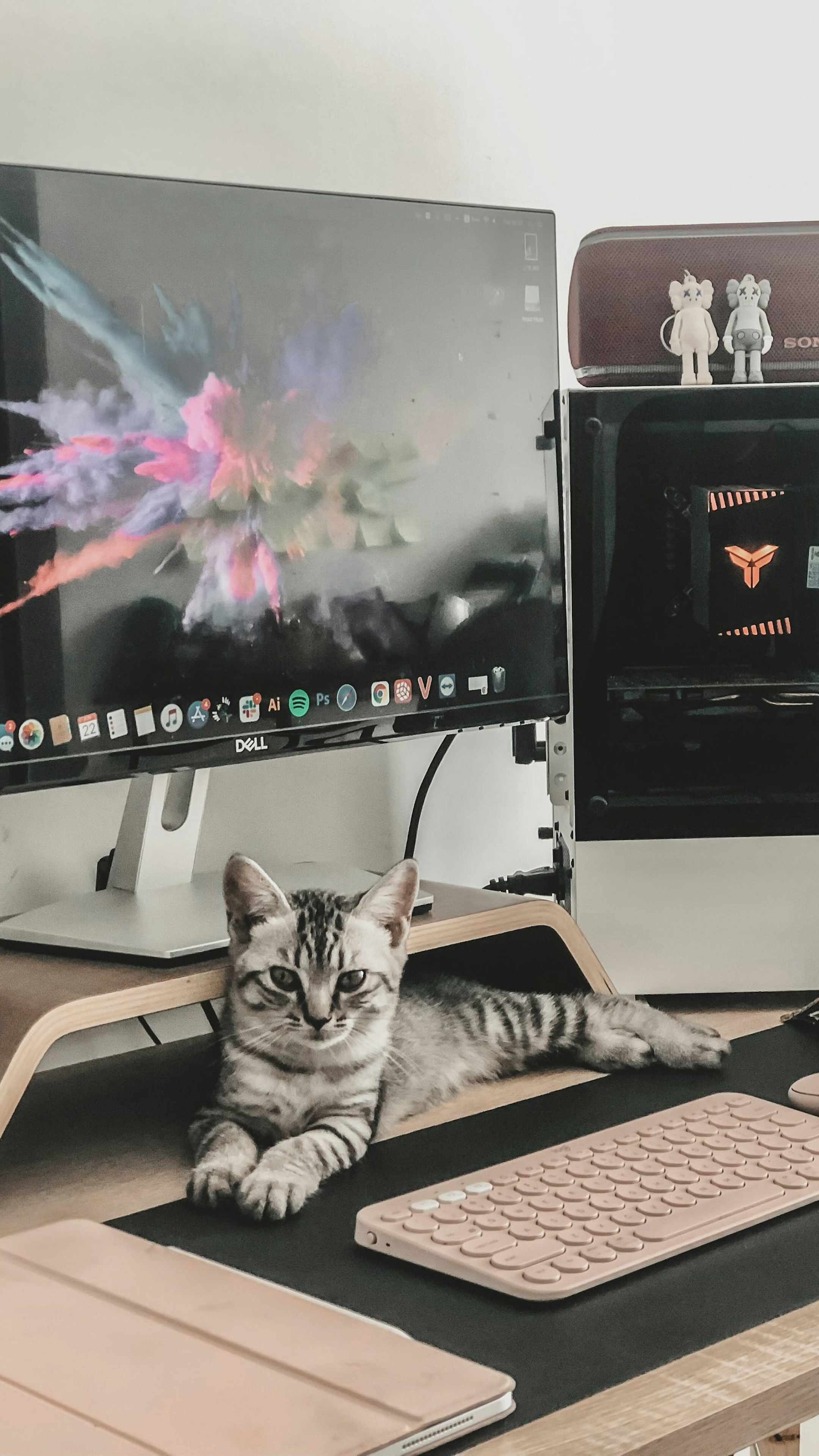 The image is high-resolution, ensuring crisp details and vibrant colors on any screen size. The cat is captured in a serene pose, showcasing its beautiful silver coat. The iMac’s clean lines complement the cat’s elegant form, creating a harmonious composition. This wallpaper is a perfect blend of technology and nature, bringing a touch of tranquility to your digital workspace.
