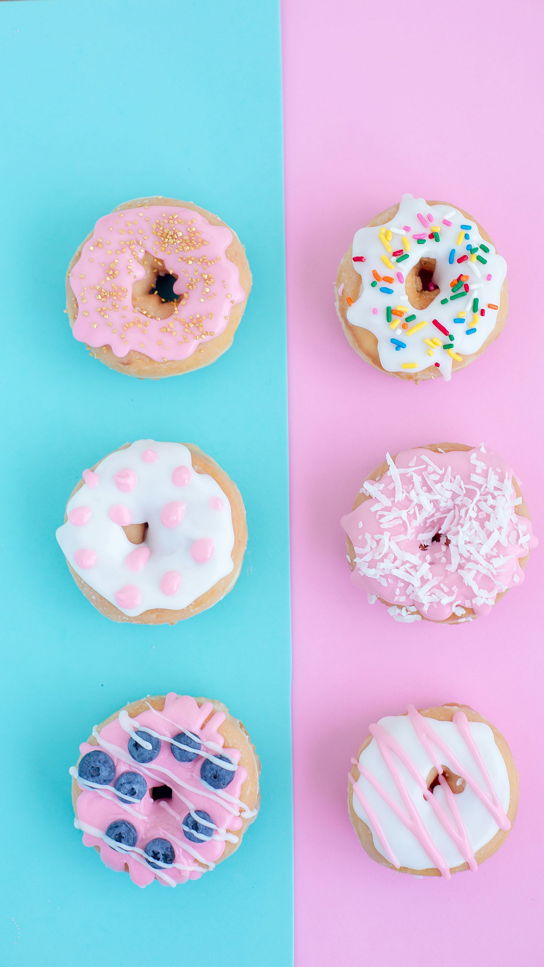 This wallpaper features a delectable display of six assorted-flavor doughnuts. Each doughnut boasts a unique and vibrant glaze, showcasing a delightful variety of colors and textures. The image is perfect for adding a touch of sweetness and whimsy to your digital devices.