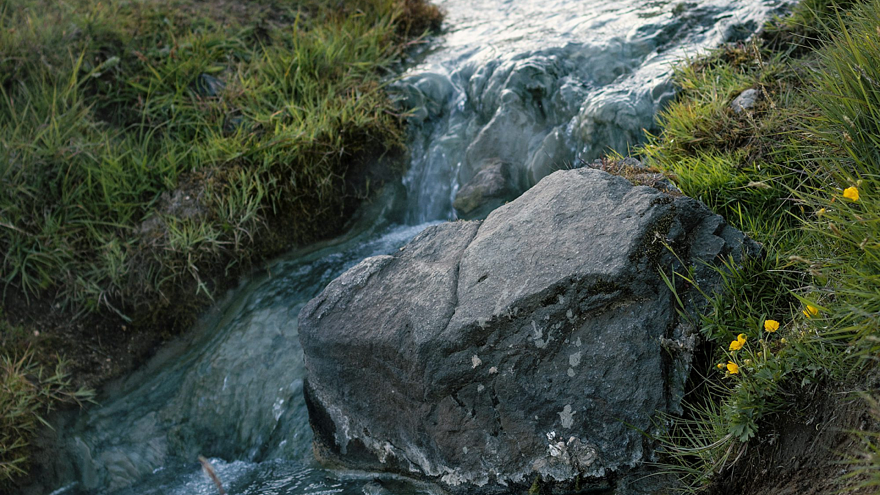 This wallpaper features a stone nestled in a stream of water during the daytime. The image likely showcases the natural beauty of a flowing water feature with a prominent rock formation. The lighting suggests it was taken during the day, highlighting the textures and colors.
