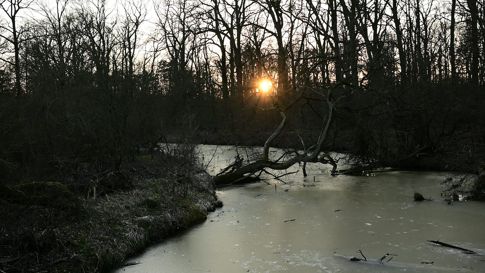 The image showcases the raw beauty of nature in winter. The sharp contrast between the warm hues of the sunset and the cold, icy river creates a visually striking image. The stillness of the scene is emphasized by the smooth texture of the ice and the soft light of the setting sun.