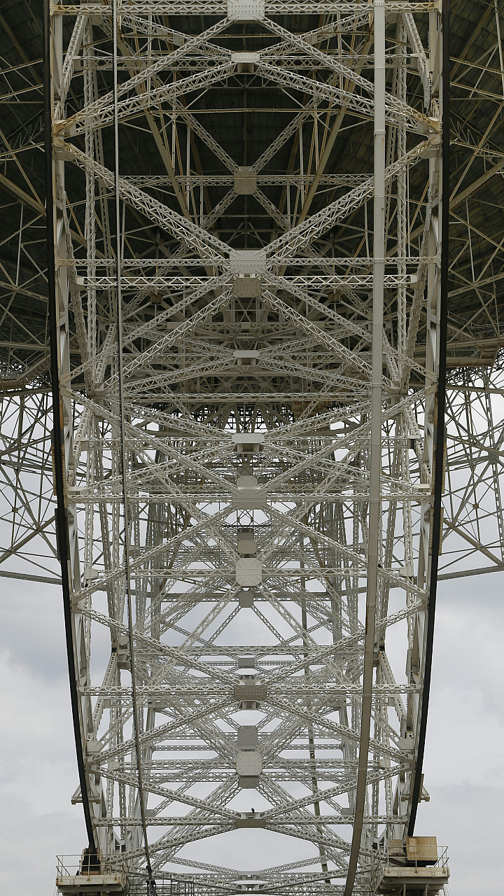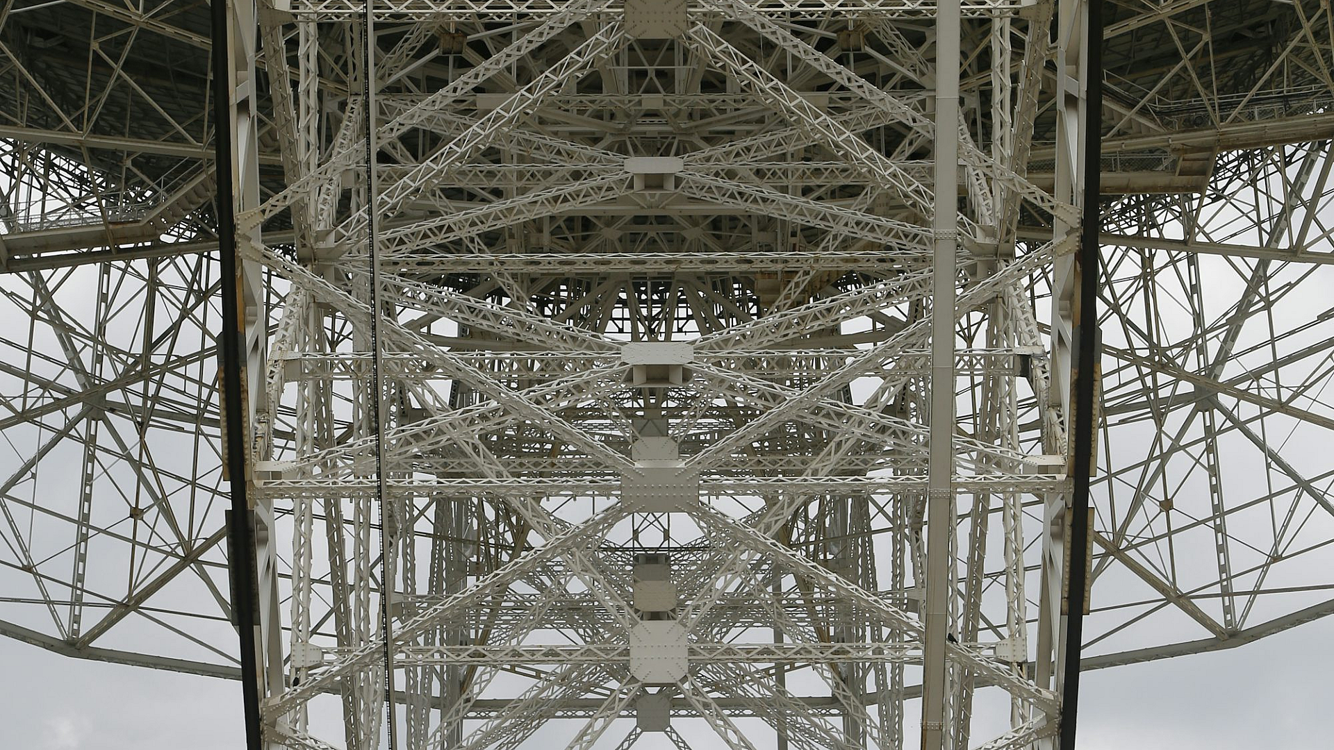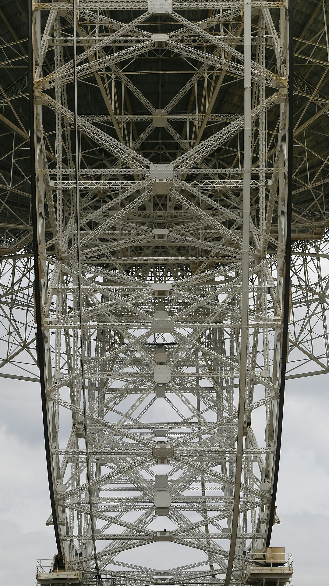 This wallpaper features a dramatic image of the underside of a large metal structure, captured against a backdrop of a cloudy sky. The focus is on the intricate details of the metalwork, showcasing the texture and shadows created by the complex arrangement of beams and girders. The overcast sky adds to the overall moody and atmospheric feel of the image.