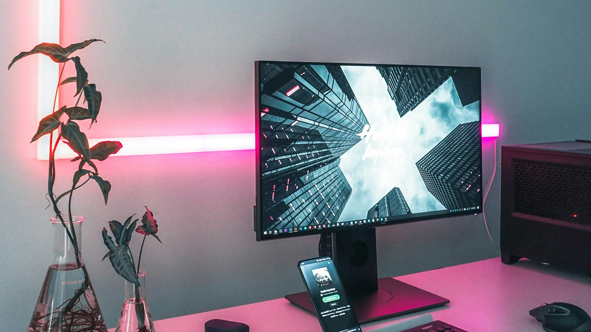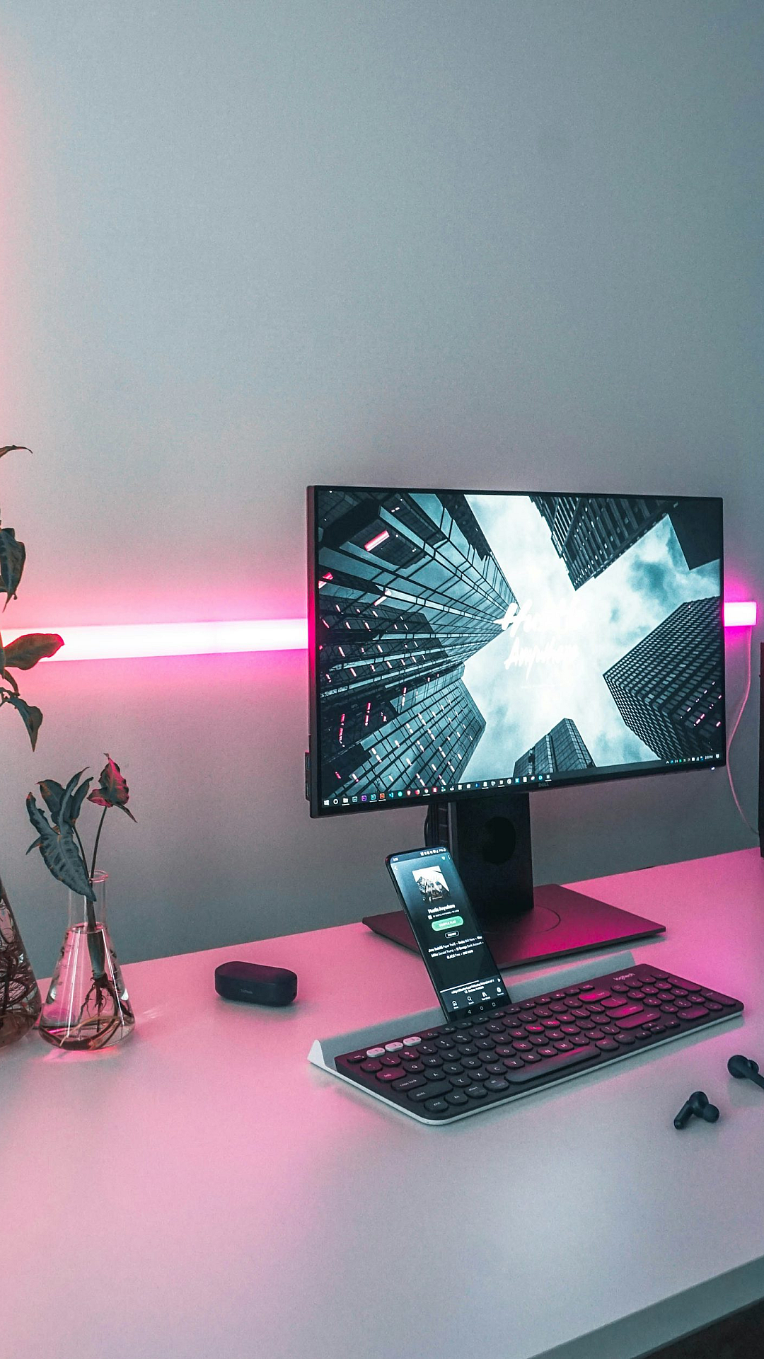 Keywords: turned-on monitor, black screen, flat screen, keyboard, computer, desktop, technology, electronics, gadget, digital, screen, display, monitor wallpaper, tech wallpaper, dark wallpaper