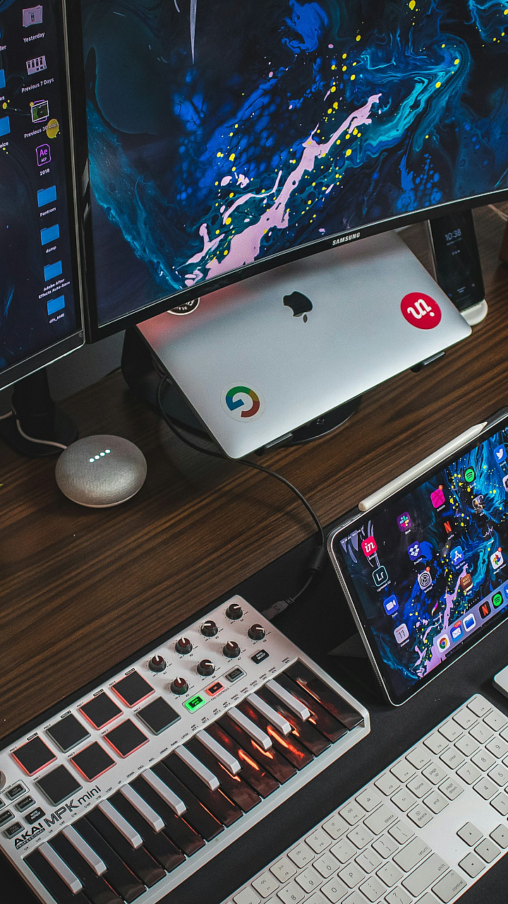 This wallpaper features a turned-on white tablet computer, prominently displayed in the foreground. It’s positioned in front of an Apple Magic Keyboard and a white Akai MIDI controller, creating a clean and minimalist scene perfect for those who appreciate sleek technology and modern design.