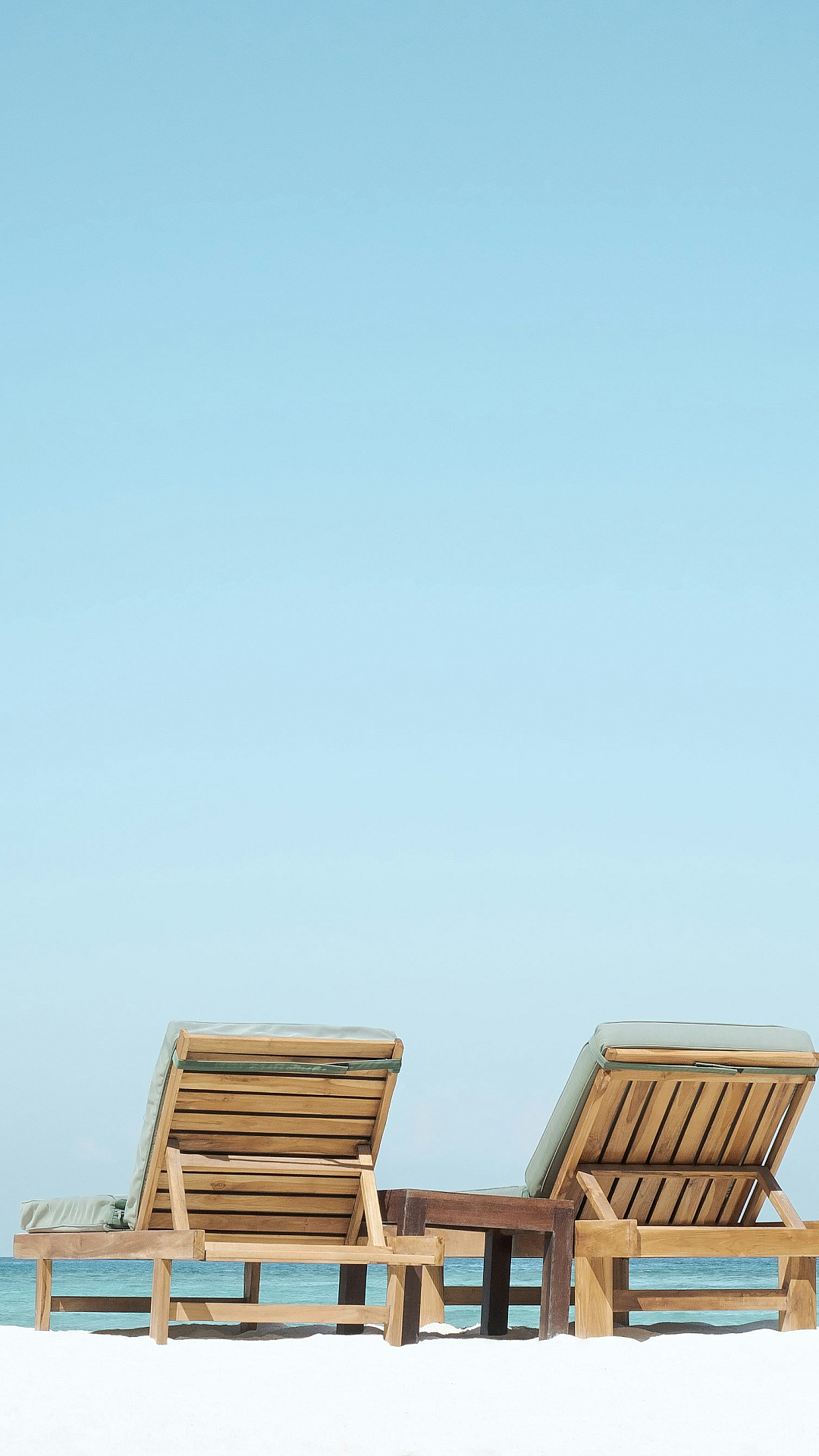 This wallpaper features two brown wooden chaise loungers situated on a beach. The image evokes a feeling of relaxation and tranquility, perfect for a calming and peaceful atmosphere.