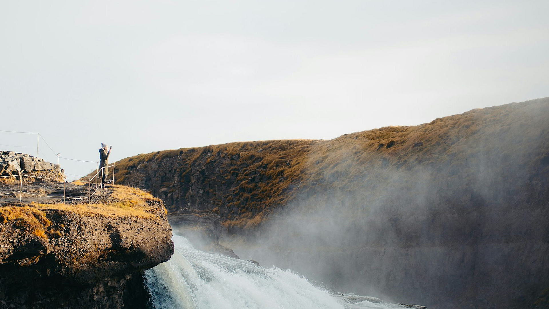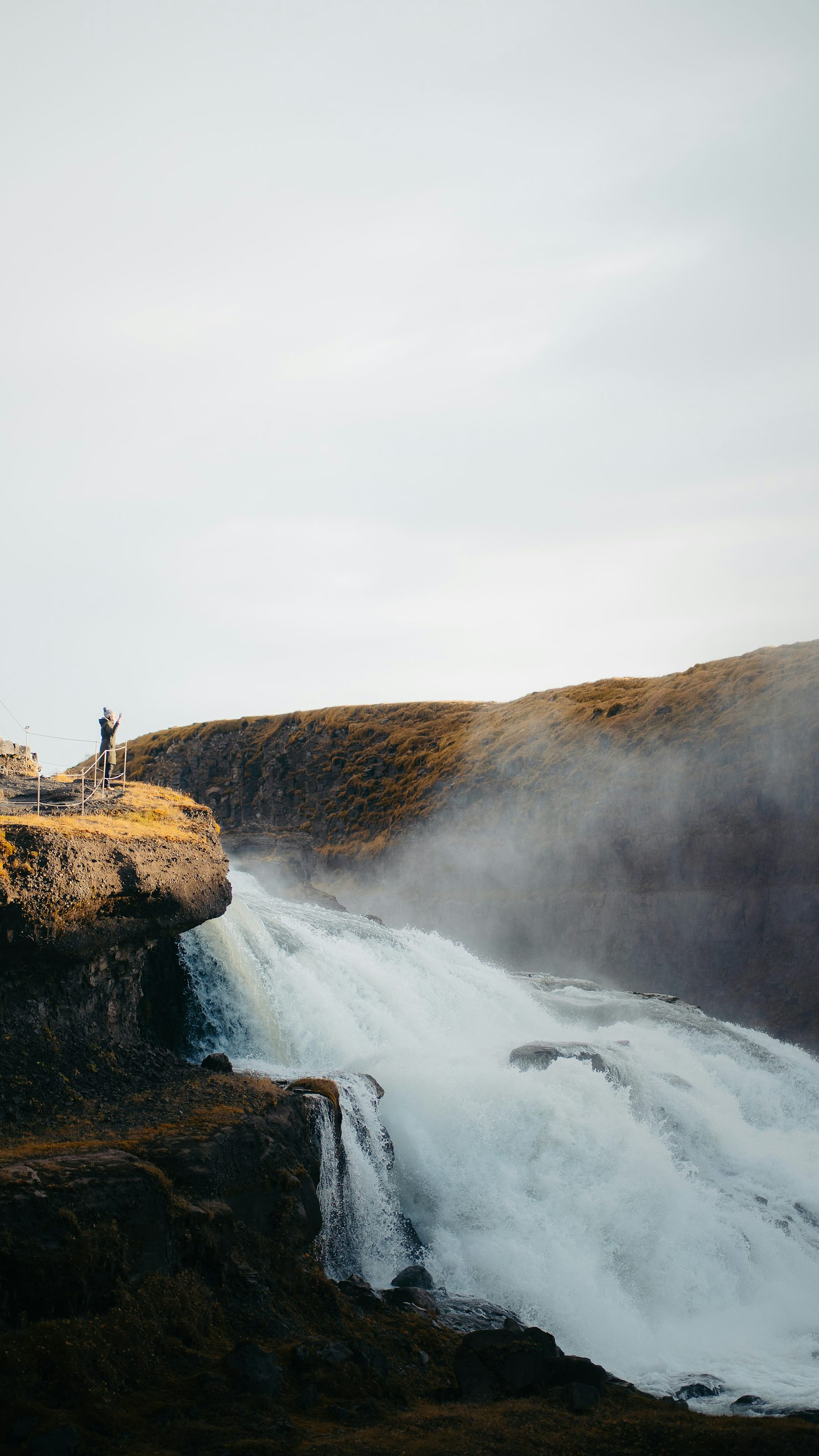 waterfall, cliff, two people, couple, lovers, friends, landscape, nature, scenery, majestic, breathtaking, awe-inspiring, adventure, travel, high, elevated, precipice, cascade, water, power, serenity