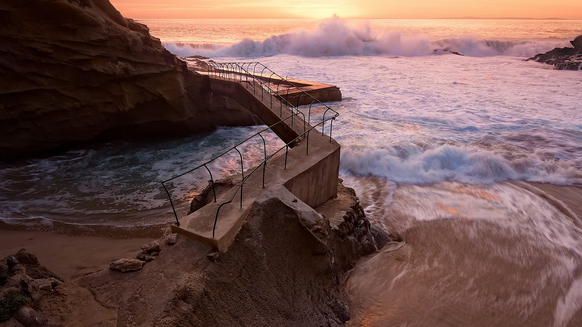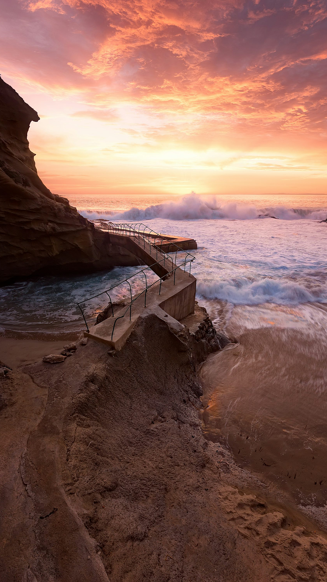 waves, ocean, sea, coast, shoreline, rocks, sunset, sundown, twilight, beach, water, crashing waves, rocky coast, natural landscape, seascape