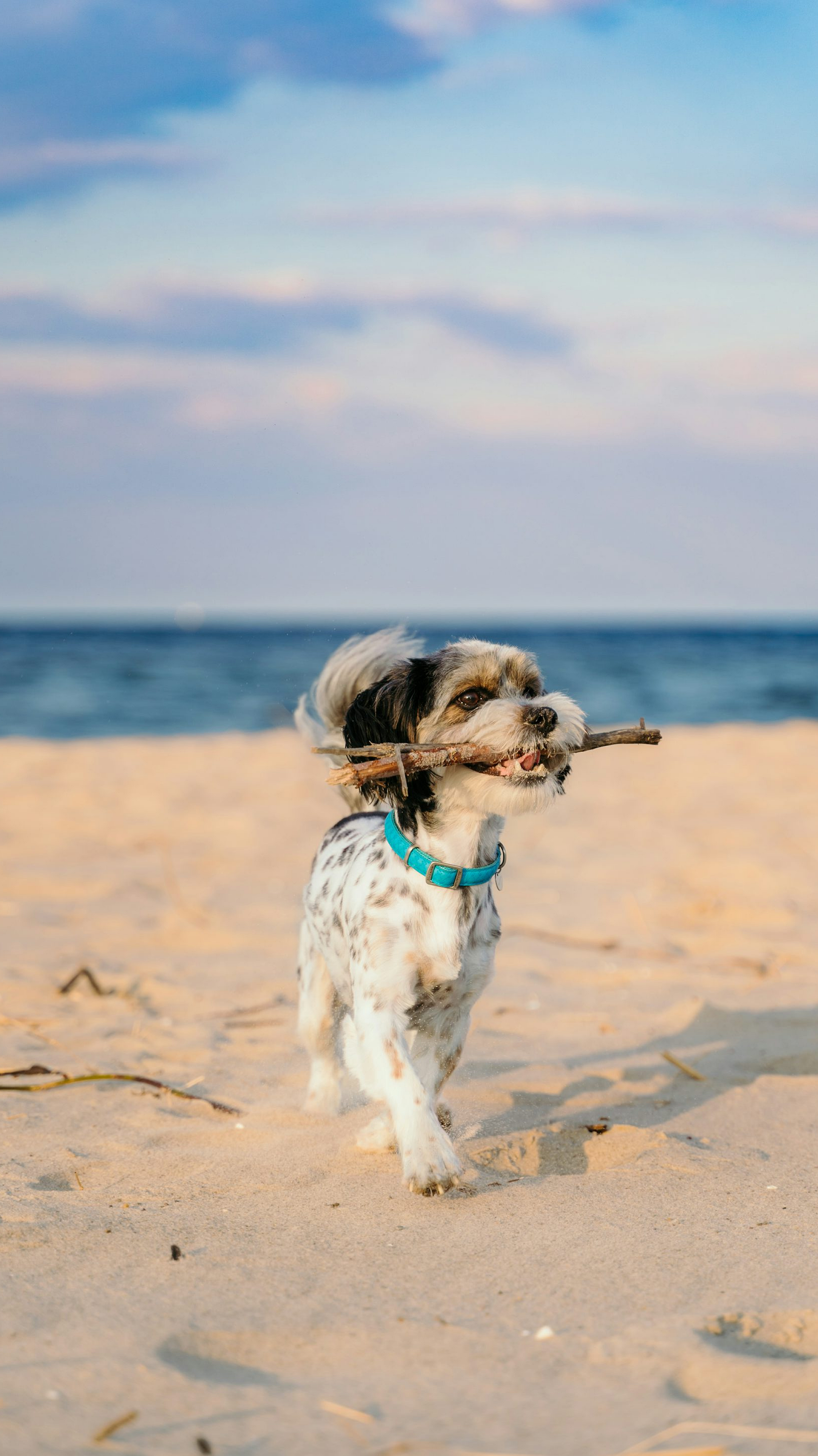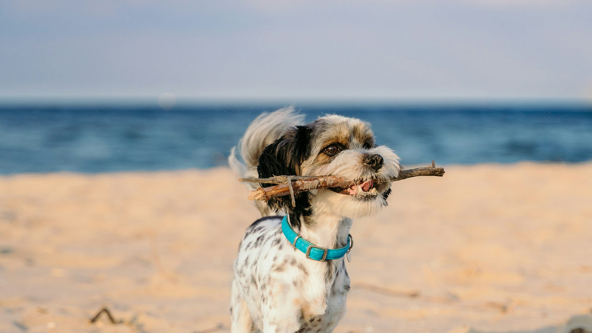 white dog, brown dog, long-haired dog, long-coated dog, beach, sand, ocean, seashore, coast, daytime, sunshine, dog wallpaper, animal wallpaper, pet wallpaper, canine wallpaper