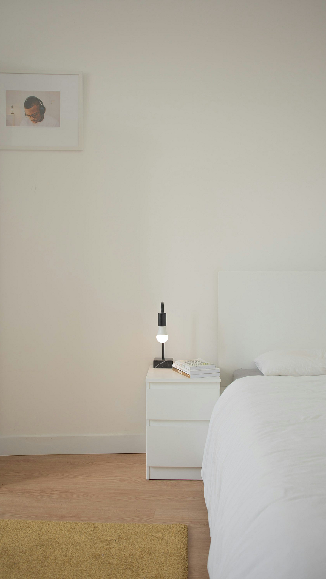 white bed linen, white nightstand, wooden nightstand, bedroom wallpaper, minimalist wallpaper, clean wallpaper, white bedroom, bedroom decor, simple bedroom, light bedroom, bedding, sheets, white furniture, minimalist decor, spacious bedroom, calm bedroom