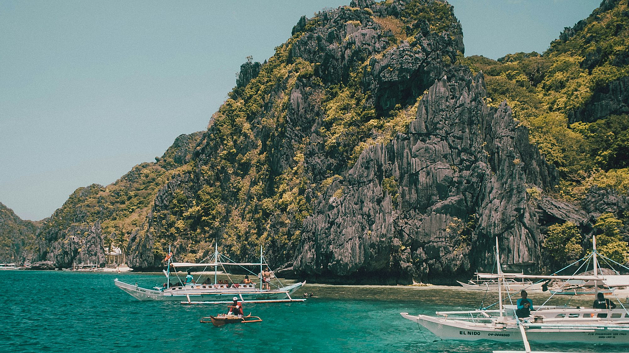 This stunning wallpaper features a white boat gently bobbing on the sea near a striking rock formation. The rocks display a beautiful contrast of green and brown hues, set against a vibrant blue sky. The image captures the serene beauty of a daytime landscape, offering a peaceful and captivating scene. The overall feeling is one of tranquility and natural beauty. The vessel appears small against the vastness of the water and the imposing rock formations, emphasizing the scale of the nature and scenery.