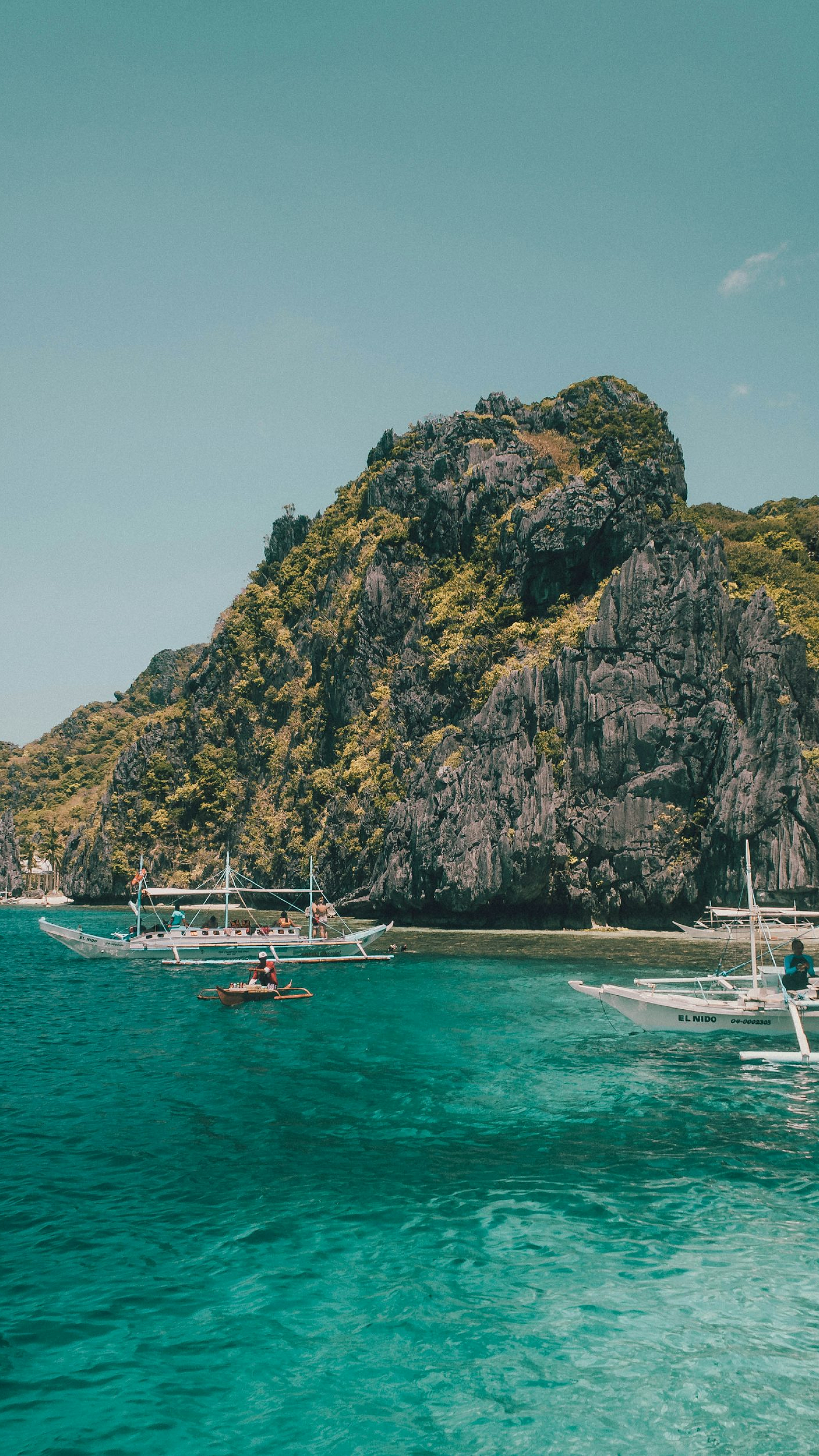 The image is perfect for anyone looking for a calming and aesthetically pleasing wallpaper. The contrast between the white boat and the green and brown rocks provides a visually interesting focal point. The clear blue sky adds a sense of openness and space. Whether you’re looking for a wallpaper for your computer, phone, or tablet, this image is sure to bring a touch of serenity to your digital life. The image offers a sense of sailing on a peaceful, idyllic day.