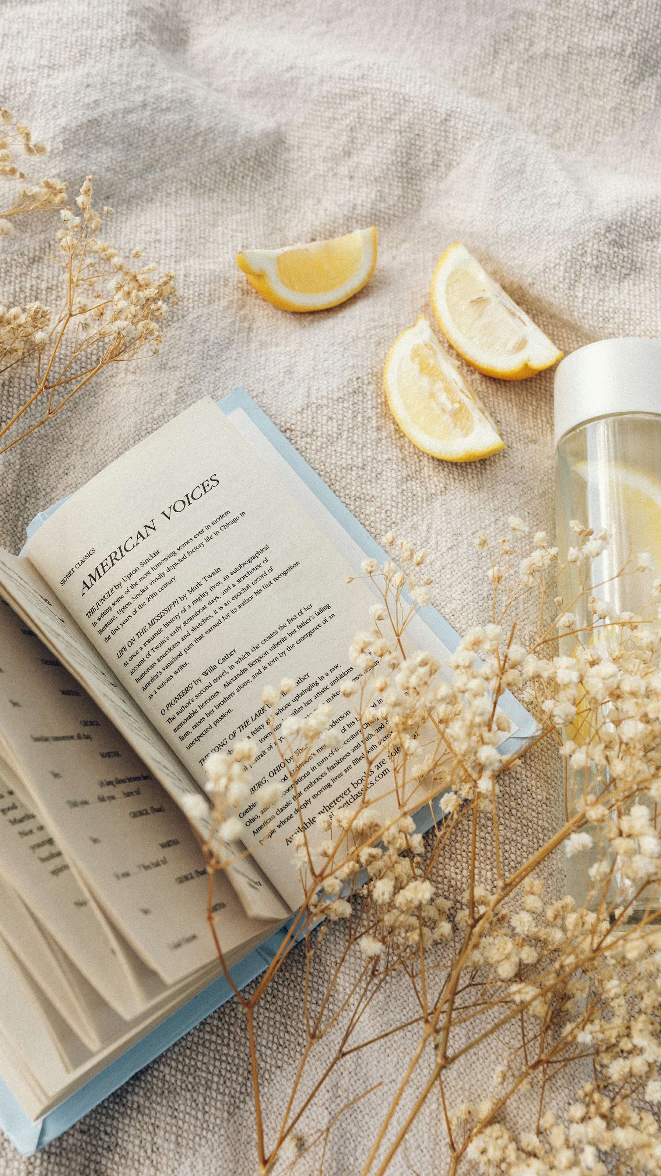 This wallpaper features a pristine white book page adorned with scattered yellow flower petals. The image offers a serene and minimalist aesthetic, perfect for those seeking a calming and elegant background for their devices. The subtle contrast between the crisp white and the vibrant yellow creates a visually appealing and sophisticated design.