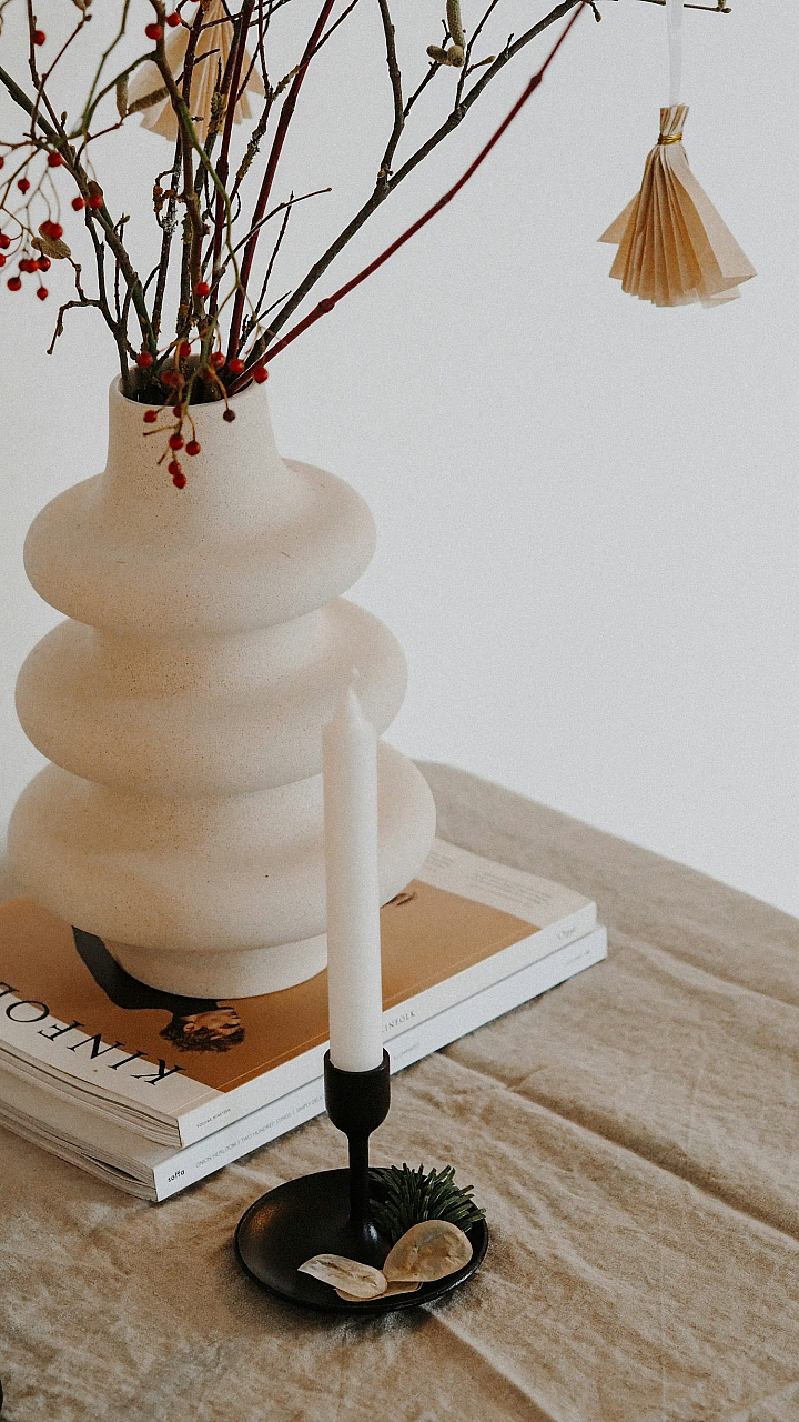 The image offers a sense of tranquility and order, making it an ideal choice for those seeking a peaceful atmosphere in their living spaces. The still life composition is both visually appealing and effortlessly stylish. The subtle texture of the ceramic vase and the pages of the book add depth and visual interest to the overall design.