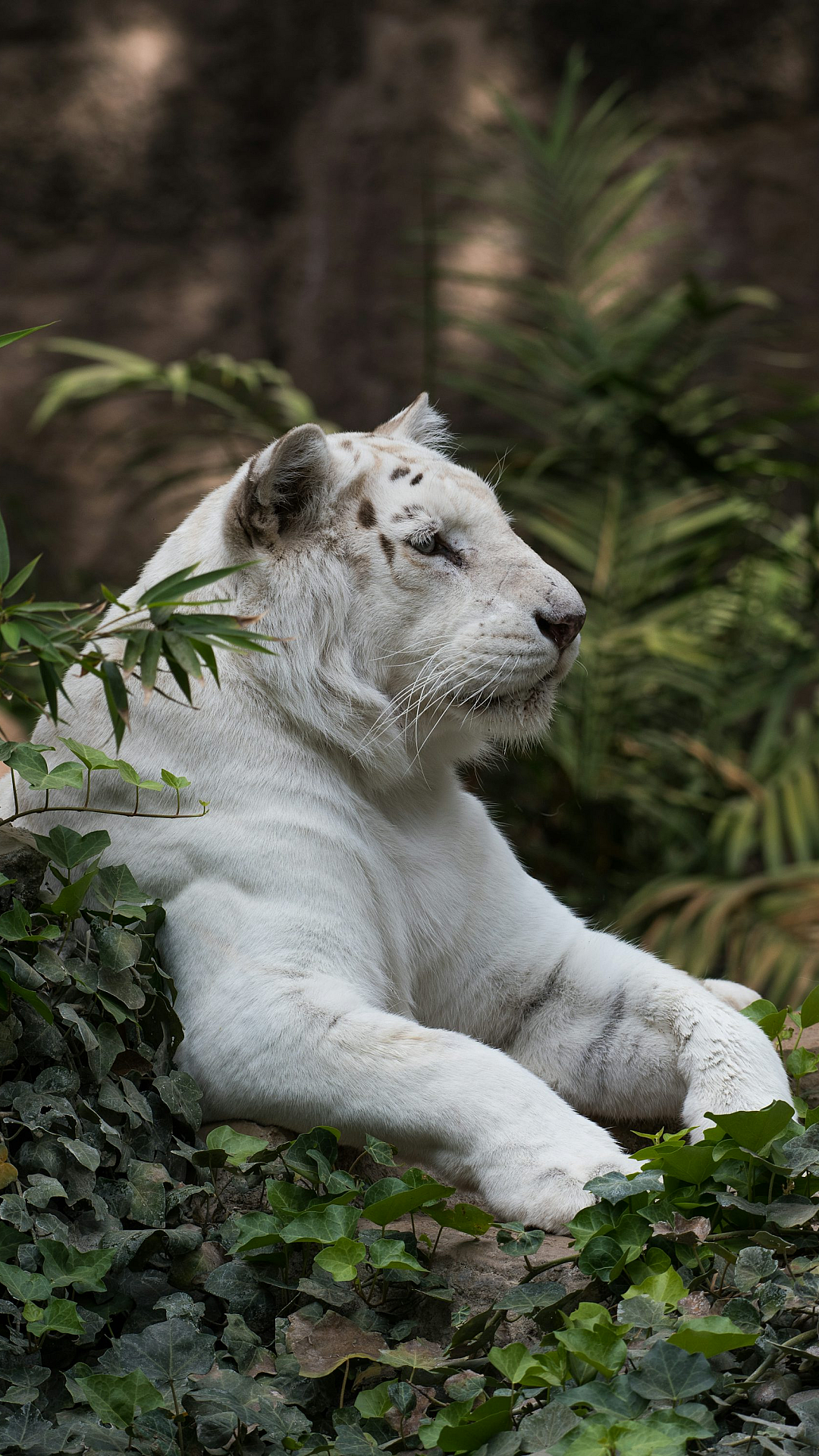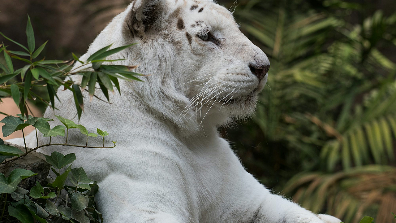 white lion, lion, wildlife, animal, wallpaper, background, green, plants, leaves, vegetation, sitting, majestic, regal, nature, big cat