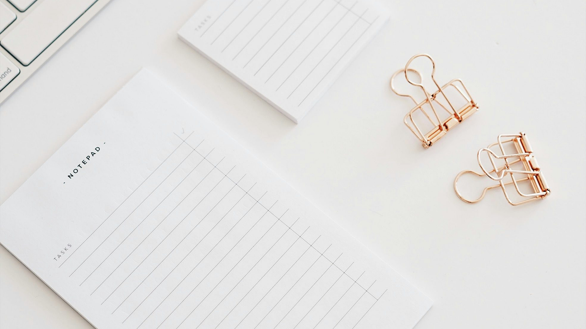 This wallpaper features a close-up image of a white paper with several paper clips neatly arranged nearby. The overall aesthetic is minimalist and clean, perfect for a desktop or mobile background.