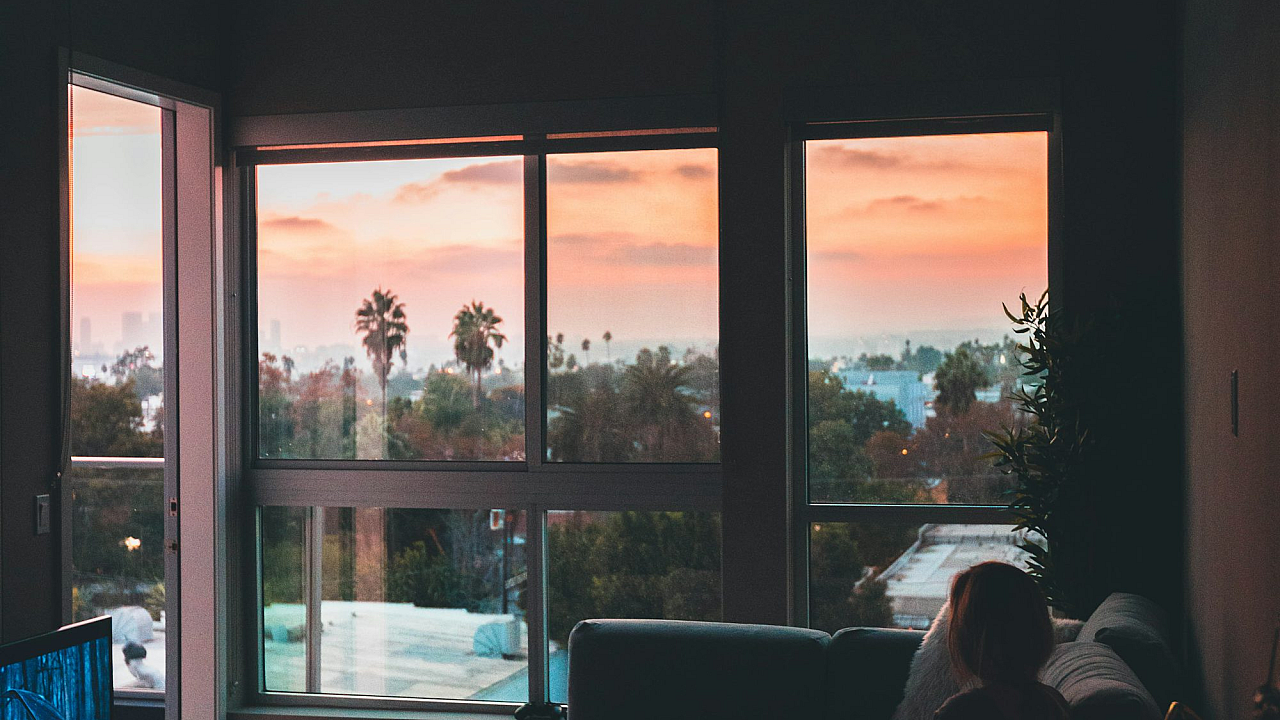 woman sitting on corner sofa beside coffee table near flat screen TV inside living room with glass window walls