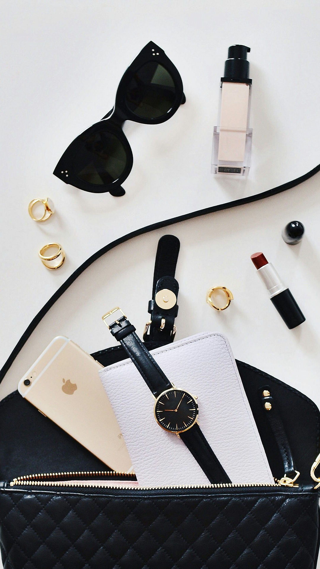 women’s sunglasses, sunglasses, shades, eyewear, black bag, handbag, purse, tote, satchel, watch, wristwatch, timepiece, iPhone 6, apple iphone, smartphone, mobile phone, fashion accessories, luxury items