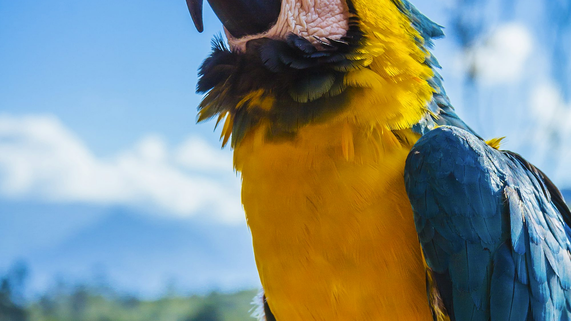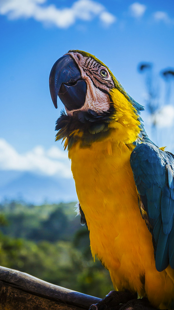 yellow parrot, blue parrot, parrot wallpaper, bird wallpaper, tropical bird, perched bird, wood perch, wooden background, vibrant colors, bright colors, tropical wallpaper, avian wallpaper, bird on branch, exotic bird, wildlife wallpaper